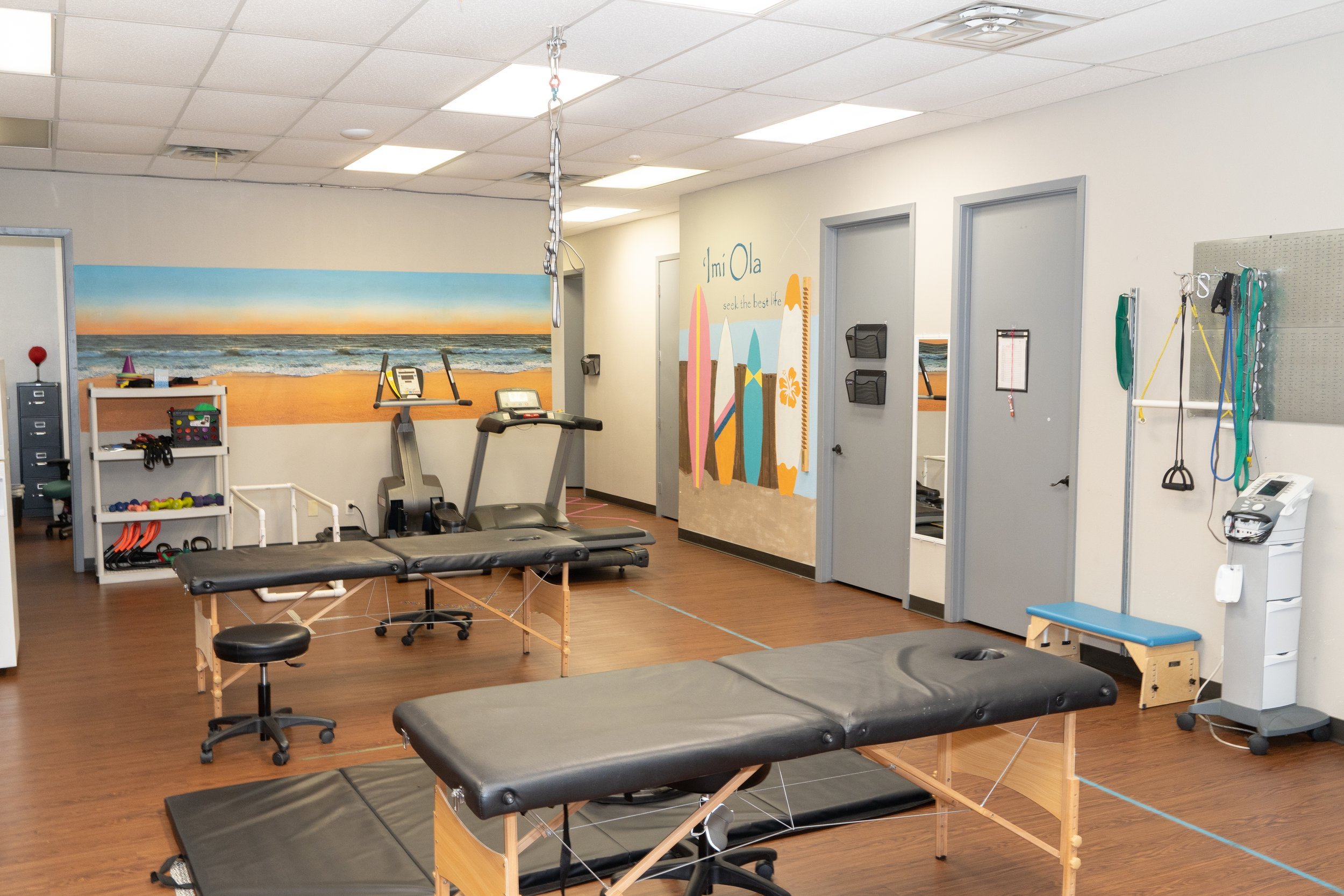 Physical therapy room with treatment tables, exercise equipment, and a mural of a beach scene on the wall.