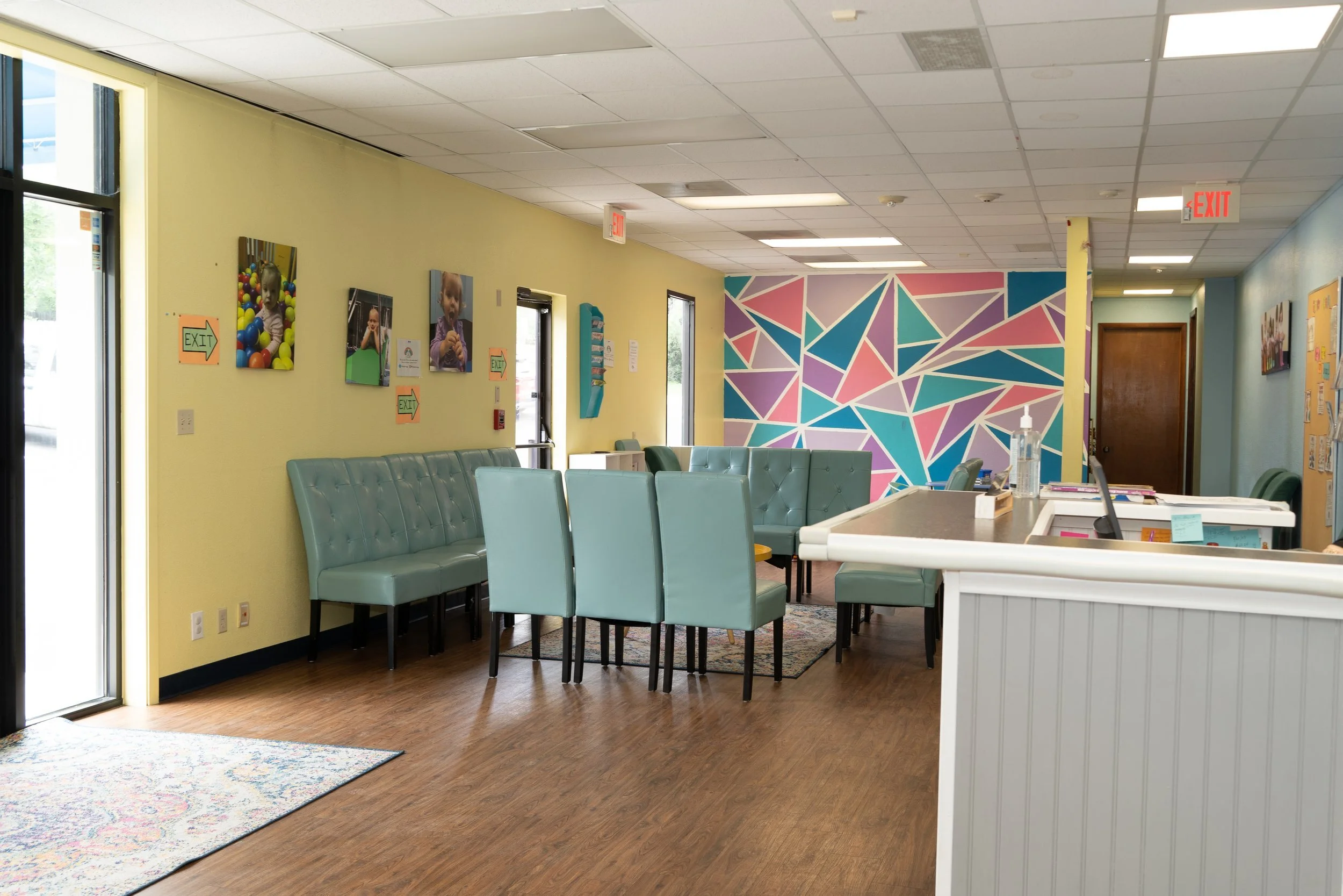 Interior of a children's waiting area with a colorful rug, a small yellow table with toys, a stack of blue chairs, a reception desk with computer and brochures, yellow walls, and a bulletin board.