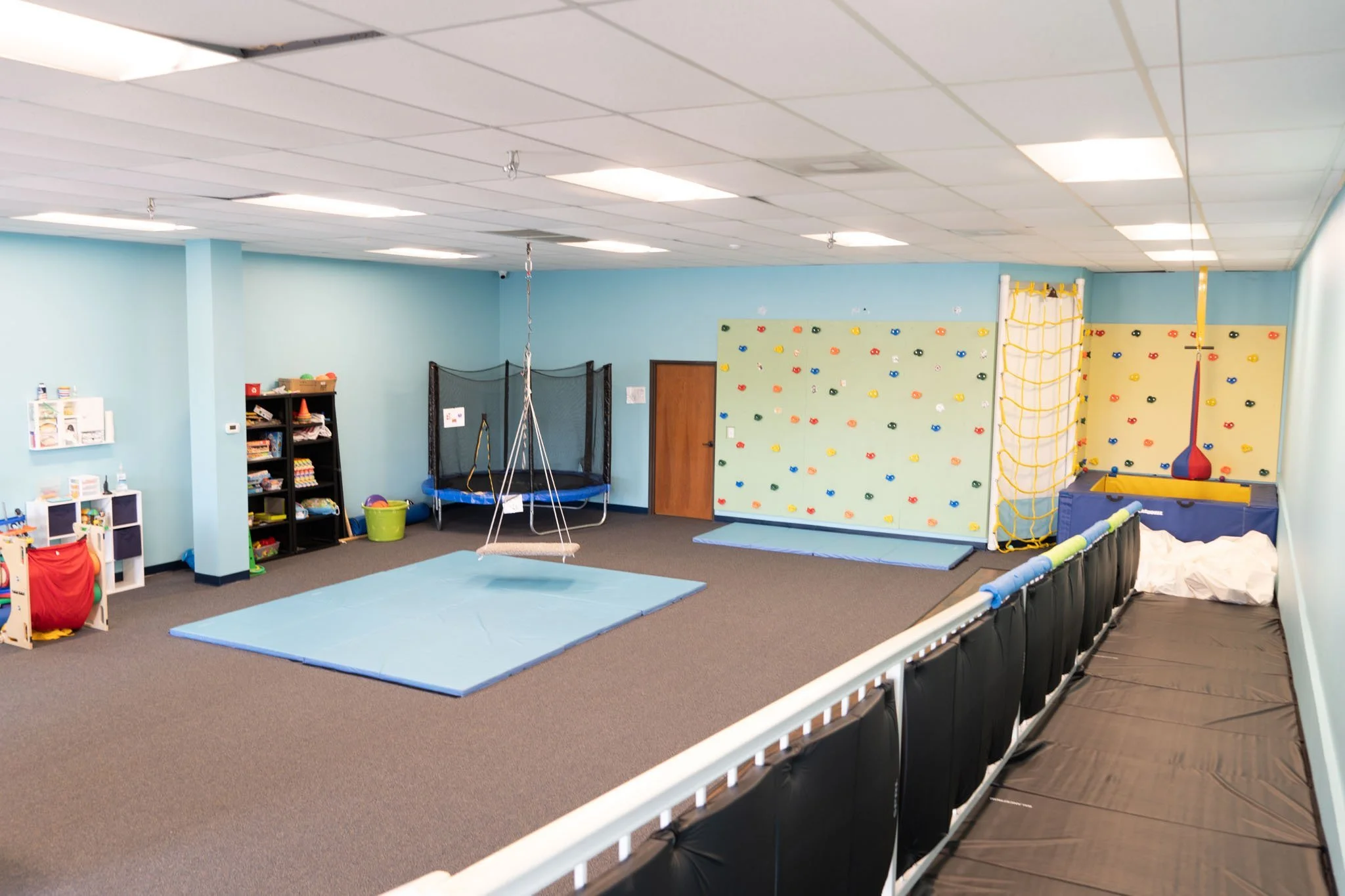 Indoor play area with swings, a hammock, padded mats, and climbing wall for children.